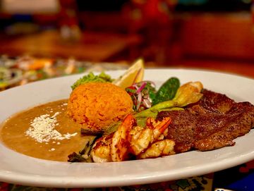 Outside skirt beef and shrimp plate, serve with cactus salad, roasted jalapeño, rice, beans, choice of tortilla, guacamole, and queso fresco.