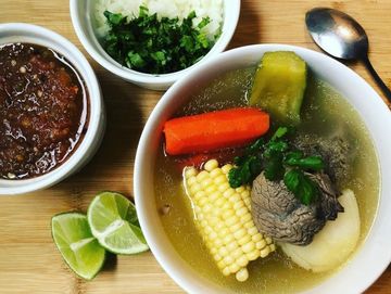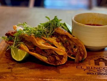 Sope prepared with refried beans, choice of meat, lettuce, pico de gallo, sour cream, queso fresco and salsa verde.