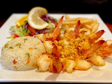Option of Shrimp a la Diabla, Al Mojo de Ajo, Empanizado, Bacon warped shrimp or Zarandeado shrimp served with rice, french fries, salad and tortillas.