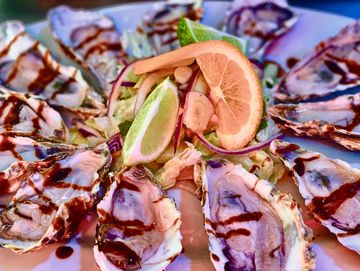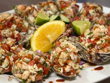 Oysters topped off with four choice of ceviche, shrimp, fish, octopus, imitation crab or mixtos