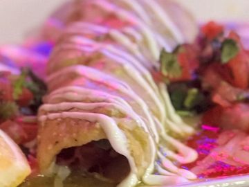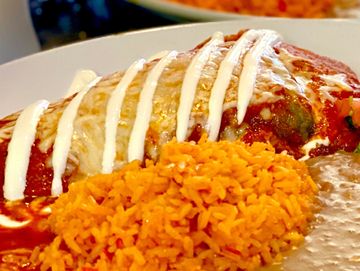 Prepared with rice, beans, your choice of meat, cilantro, onions and salsa; topped off with red or green salsa, Monterey cheese, sour cream and pico de gallo.