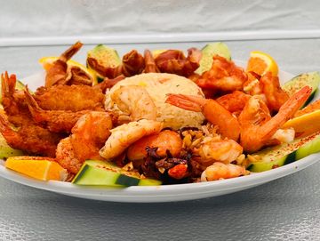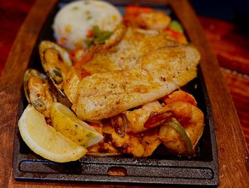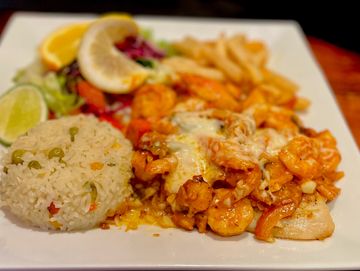 Grilled Tilapia filet topped off with a mix of shrimp, octopus, imitation crab, fajita veggies on our creamy chipotle/ mayo sauce and melted Monterey cheese; served with rice, salad and fries.