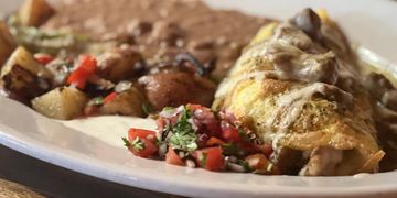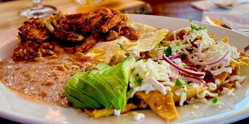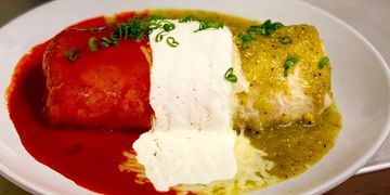 Choice of red or green salsa, served with cilantro, onions, queso fresco, sour cream, refried beans, and choice of eggs.
