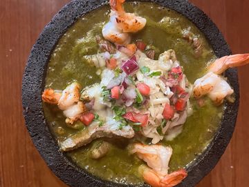 Grill steak, chicken and shrimp sauté with green salsa, topped off with Monterey cheese and pico de gallo, served with choice of tortillas, rice and beans.
