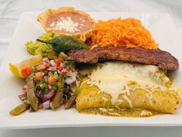 Outside skirt beef and 2 Enchilada combination plate, served with rice, beans, cactus salad, and guacamole.