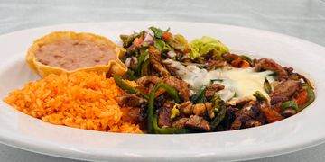 Ribeye Steak grilled with tomatoes, jalapeño, onions and poblano peppers topped with melted Monterey cheese, served with rice, beans, pico de gallo, and guacamole.