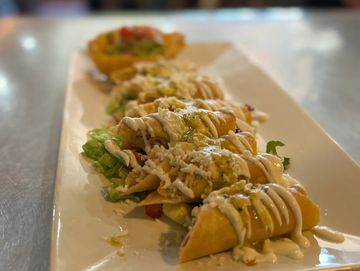 Crispy rolled taquitos, stuffed with shredded chicken served with lettuce, pico de gallo, sour cream, green salsa and guacamole.
